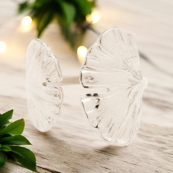 Bague en acier inoxydable composée d’une ouverture à l’avant et de deux feuilles de gingko texturées.