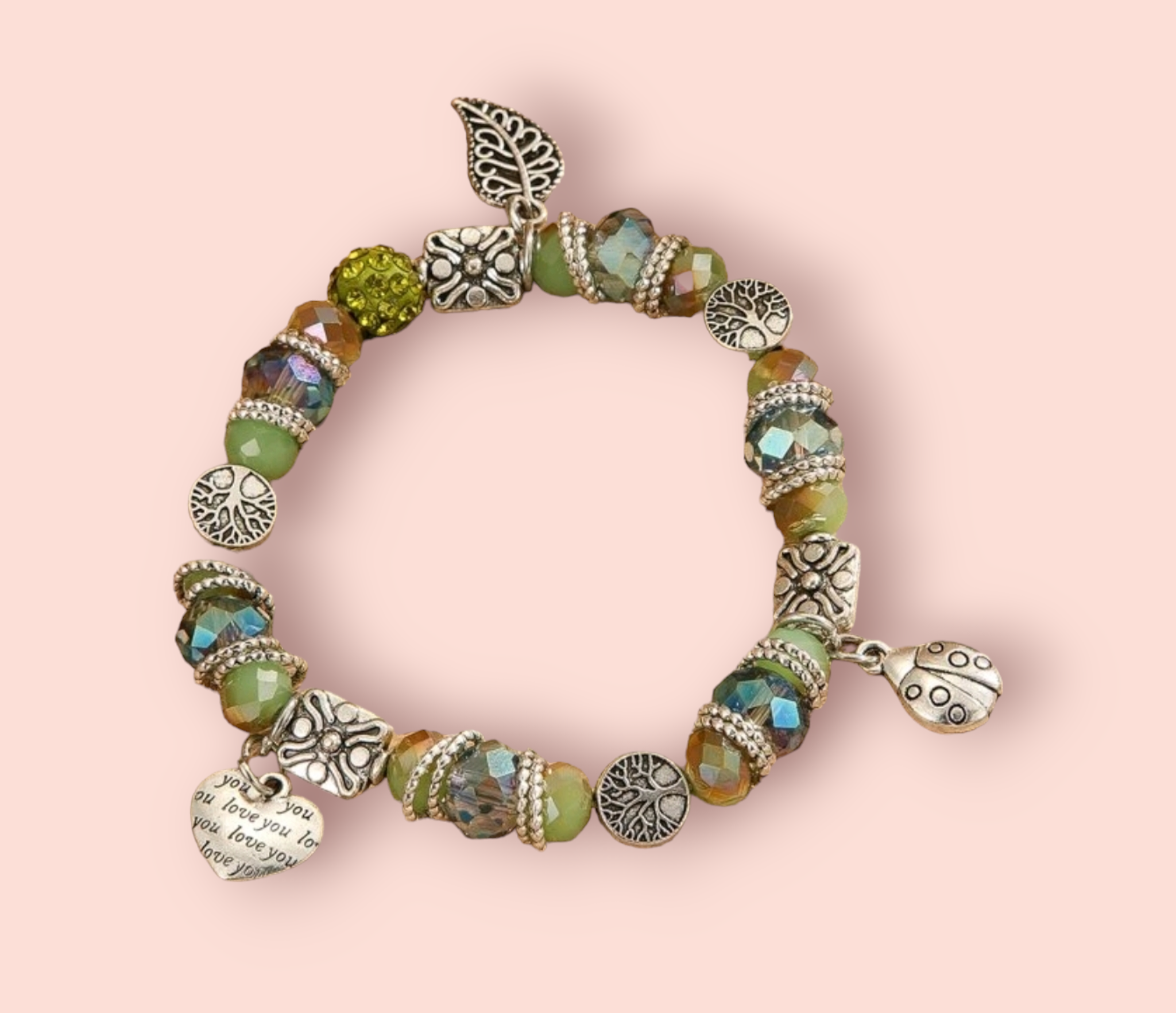 Bracelet Artisanal « Nature Enchantée » – Perles de Cristal Vert, Arbre de Vie et Charms Chance