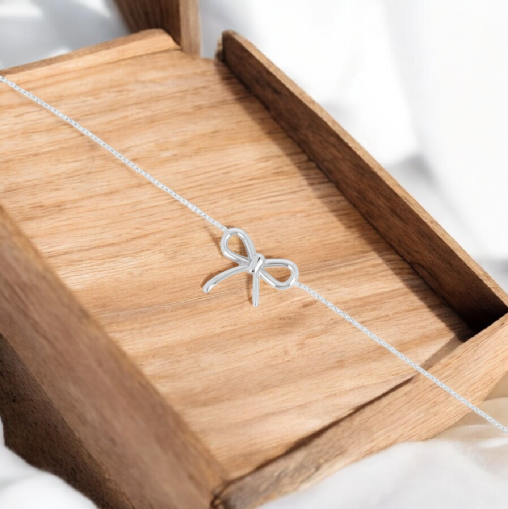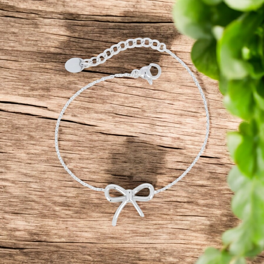 Ajoutez une touche de douceur et d’élégance à votre poignet avec ce bracelet fin en couleur argent orné d’un délicat nœud. Un bijou intemporel, féminin et facile à porter au quotidien.