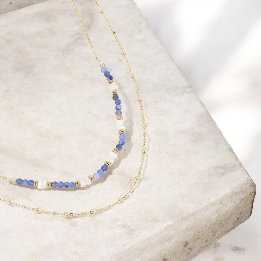 Collier 2 rangs en acier inoxydable composé d’une chaîne avec des boules en acier ainsi que d’une chaîne avec des pierres naturelles et des perles d’eau douce.