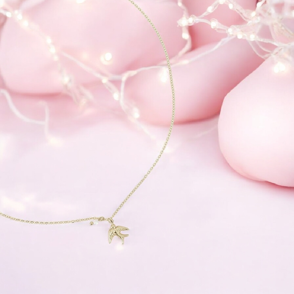 « Collier sur chaîne en acier inoxydable composé d’une fine maille forçat avec un pendentif sous la forme d’un petit oiseau et d’une petite perle d’eau douce.