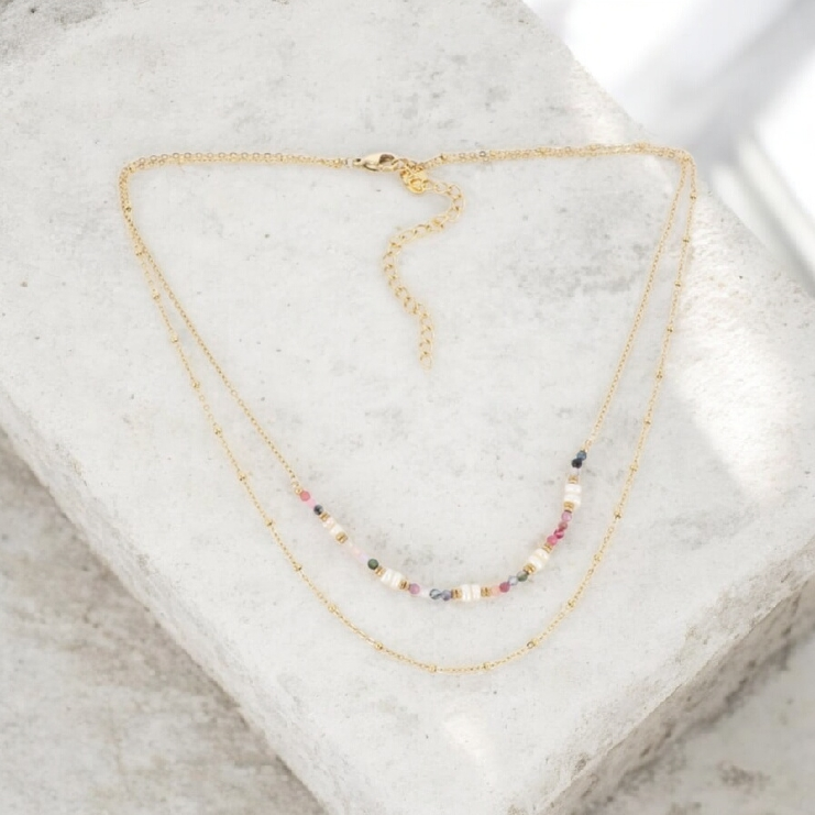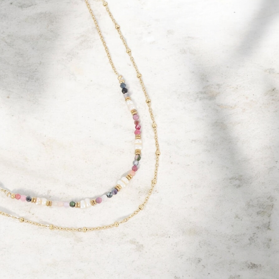Collier 2 rangs en acier inoxydable composé d’une chaîne avec des boules en acier ainsi que d’une chaîne avec des pierres naturelles et des perles d’eau douce.