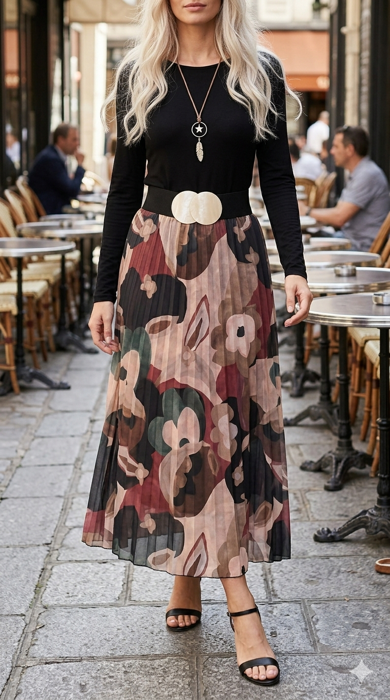 Pour un look élégant de bureau/soirée : Associez-la à un top noir uni, une large ceinture contrastante pour marquer la taille (comme sur la photo) et des talons hauts.