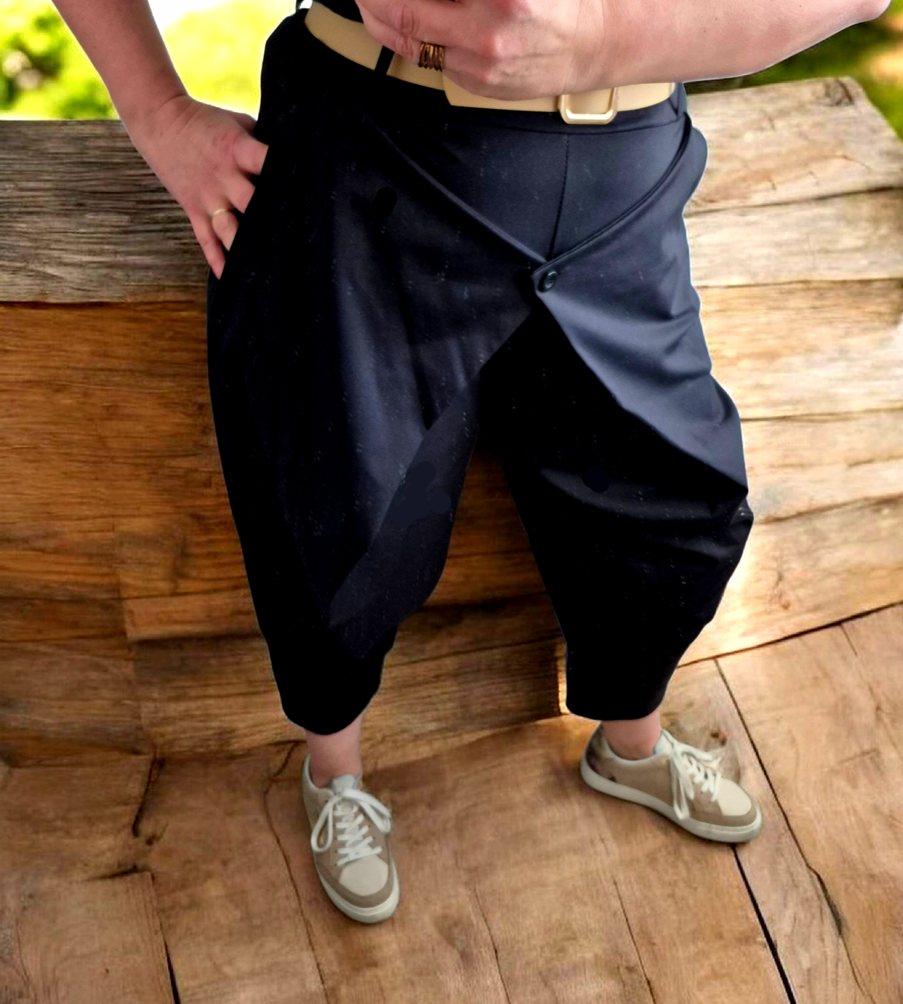 Le détail croisé sur le devant, fermé par un bouton, apporte une touche originale et sophistiquée à ce sarouel chic, parfait pour un look urbain, bohème ou casual chic. Sa couleur noir intemporelle se marie facilement avec un top clair, une blouse fluide ou un pull léger.