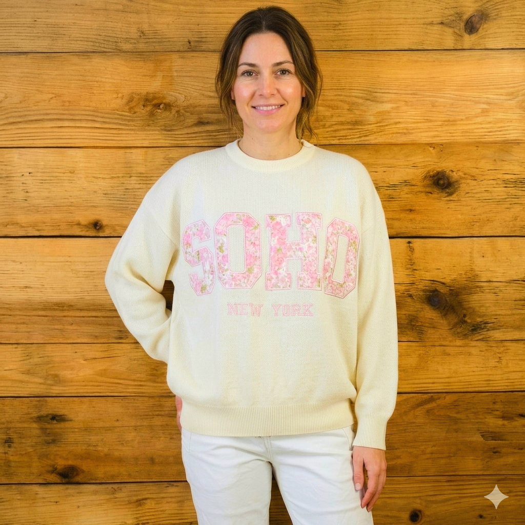 Craquez pour ce pull femme écru au style à la fois tendance et intemporel, inspiré de l’esprit new-yorkais. Son inscription “SOHO New York” en lettres florales roses apporte une touche romantique et moderne qui fait toute la différence.