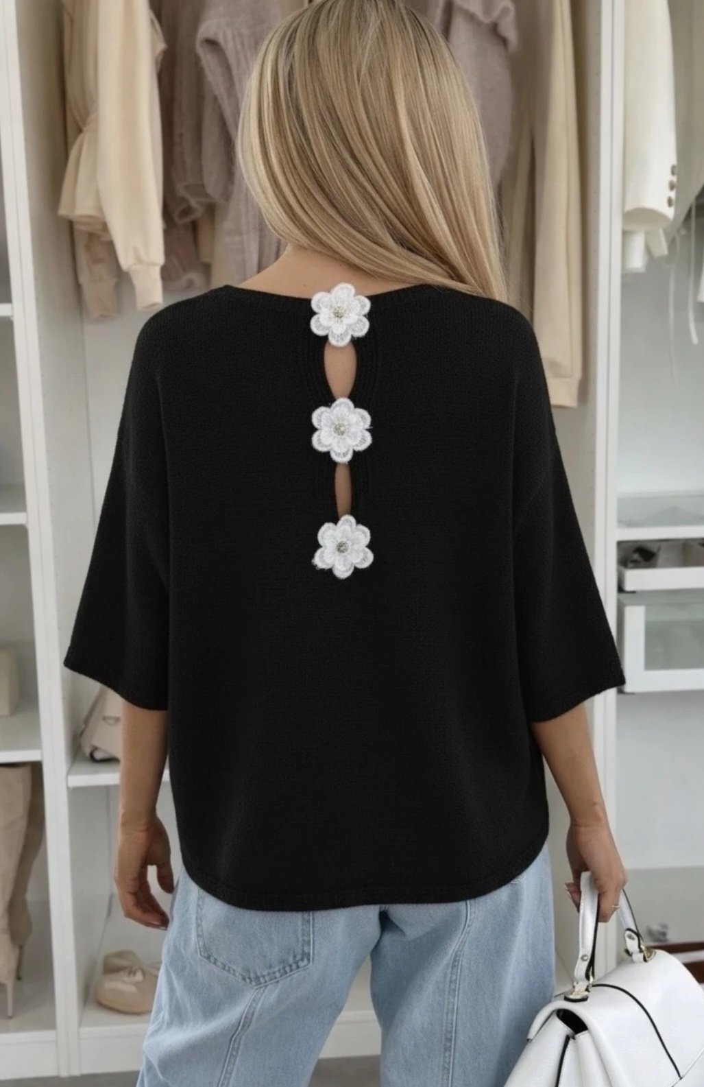 Pull Noir Col V Dos Ouvert avec Fleurs Bijoux