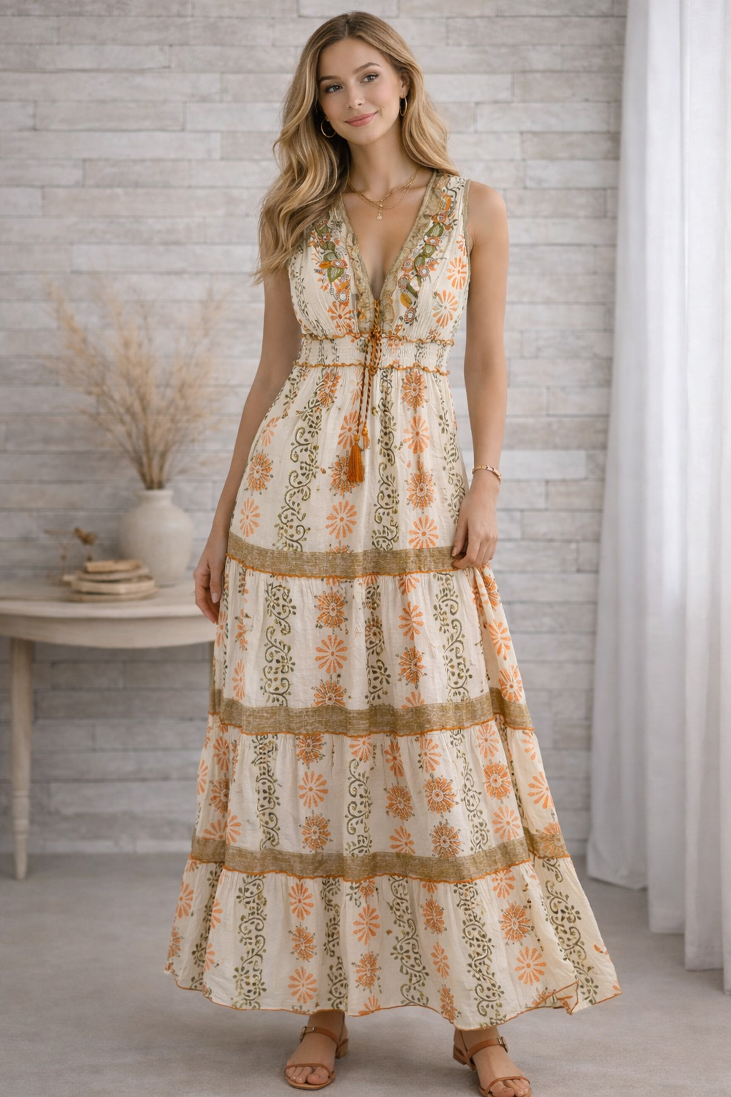Adoptez un style chic et décontracté avec notre robe longue bohème Orange, parfaite pour les beaux jours ! Avec son imprimé floral aux nuances orangées de blanc, cette robe légère et fluide est une véritable invitation à la douceur estivale.
