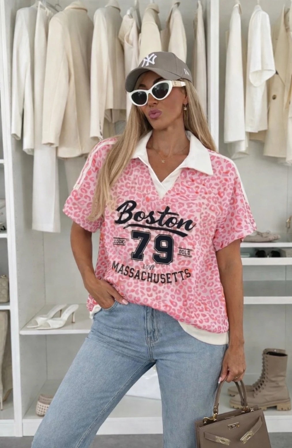 Polo Sweat Femme Imprimé Léopard Rose – Style « Boston 79 » – Casual & Chic