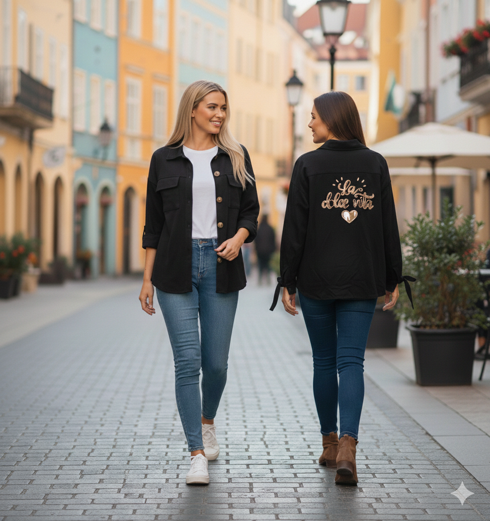 Optez pour un style tendance et confortable avec cette veste femme à boutons en 100% coton. Sa coupe décontractée, ses poches pratiques et son inscription élégante “La Dolce Vita” dans le dos en font une pièce originale et indispensable à votre garde-robe.