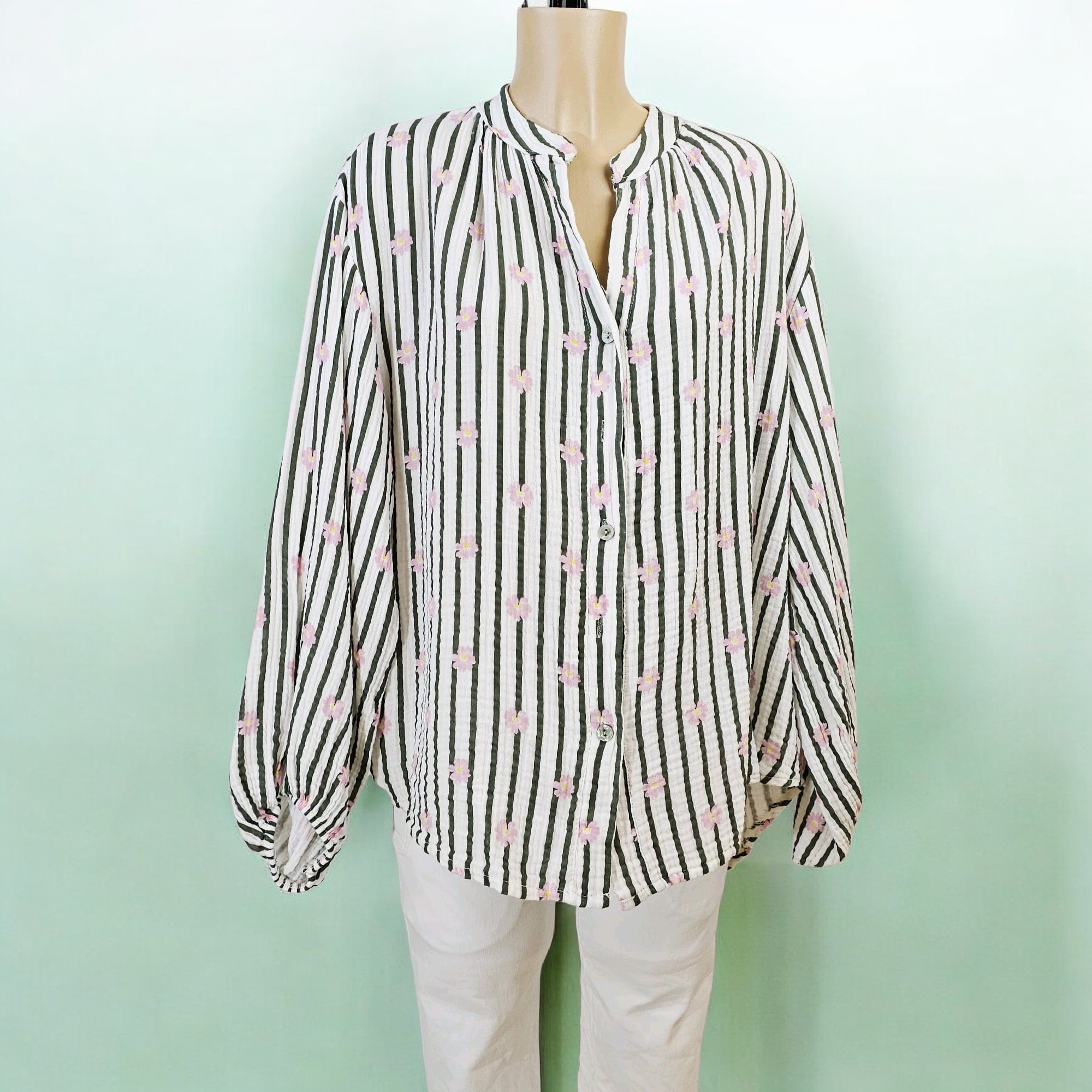 Apportez une touche de fraîcheur et de féminité à votre garde-robe avec cette charmante chemise à rayures, délicatement ornée de petites fleurs. Son motif subtil associe l’intemporel des rayures à la douceur florale pour un style à la fois moderne et romantique.