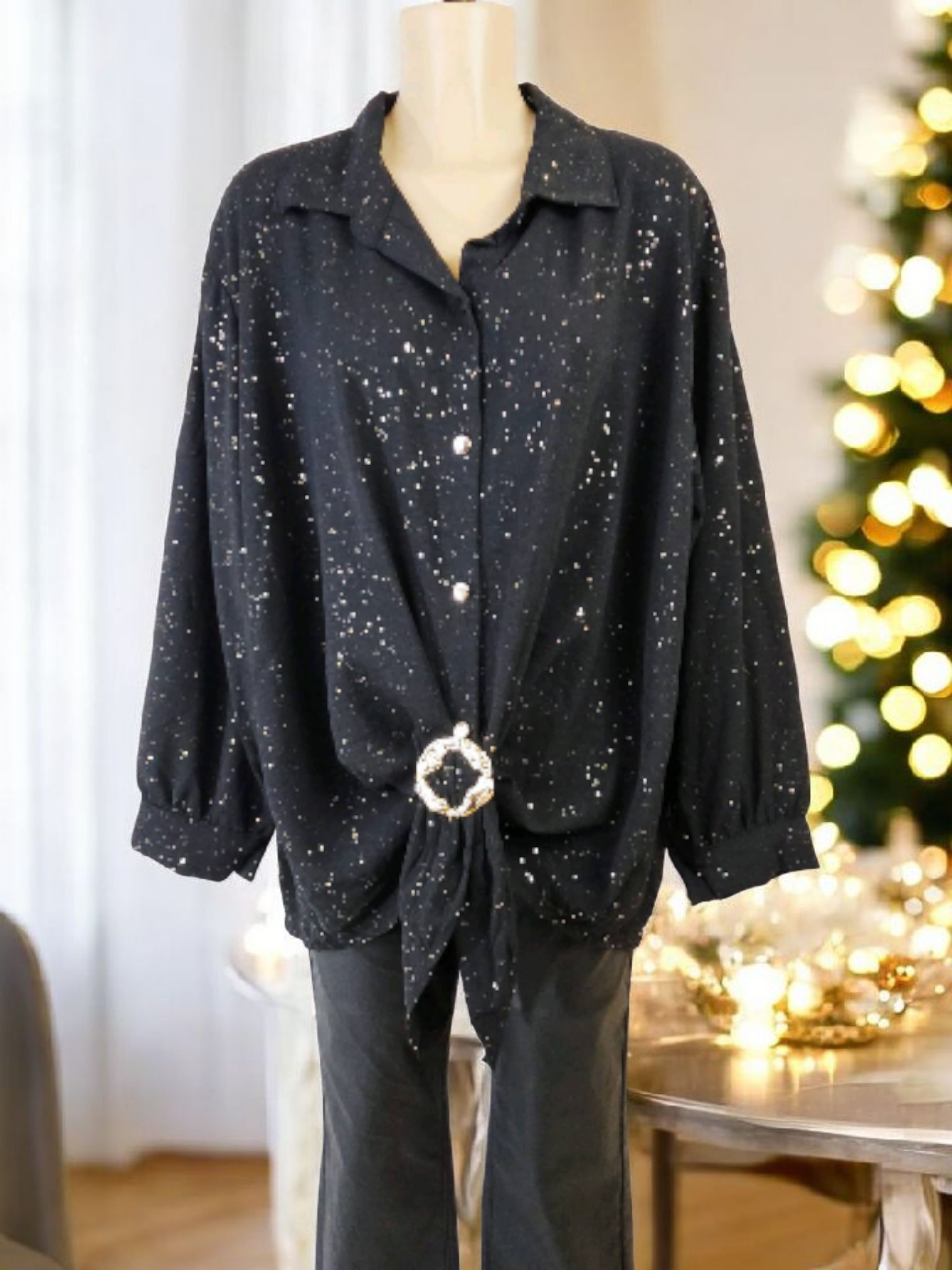 Ce chemisier noir à paillettes discrètes est la pièce parfaite pour illuminer votre tenue sans en faire trop. Sa coupe ample offre une allure décontractée mais raffinée, tandis que son tissu fluide apporte une sensation de légèreté agréable à porter toute la journée.