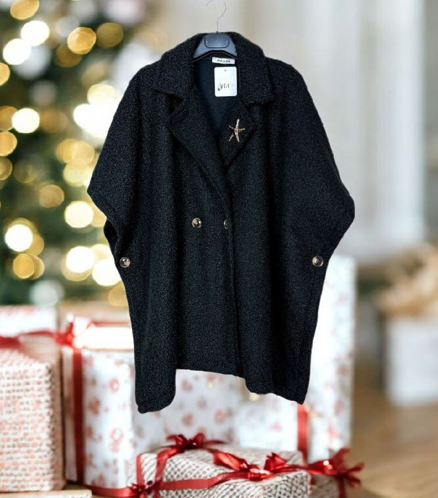 Sa coupe ample et raffinée s’adapte à toutes les morphologies (≈ tailles 44 à 52), offrant un style chic sans compromis sur le confort. Le double boutonnage apporte une touche de sophistication, tandis que la broche étoile délicatement posée sur le col ajoute une note glamour et originale.