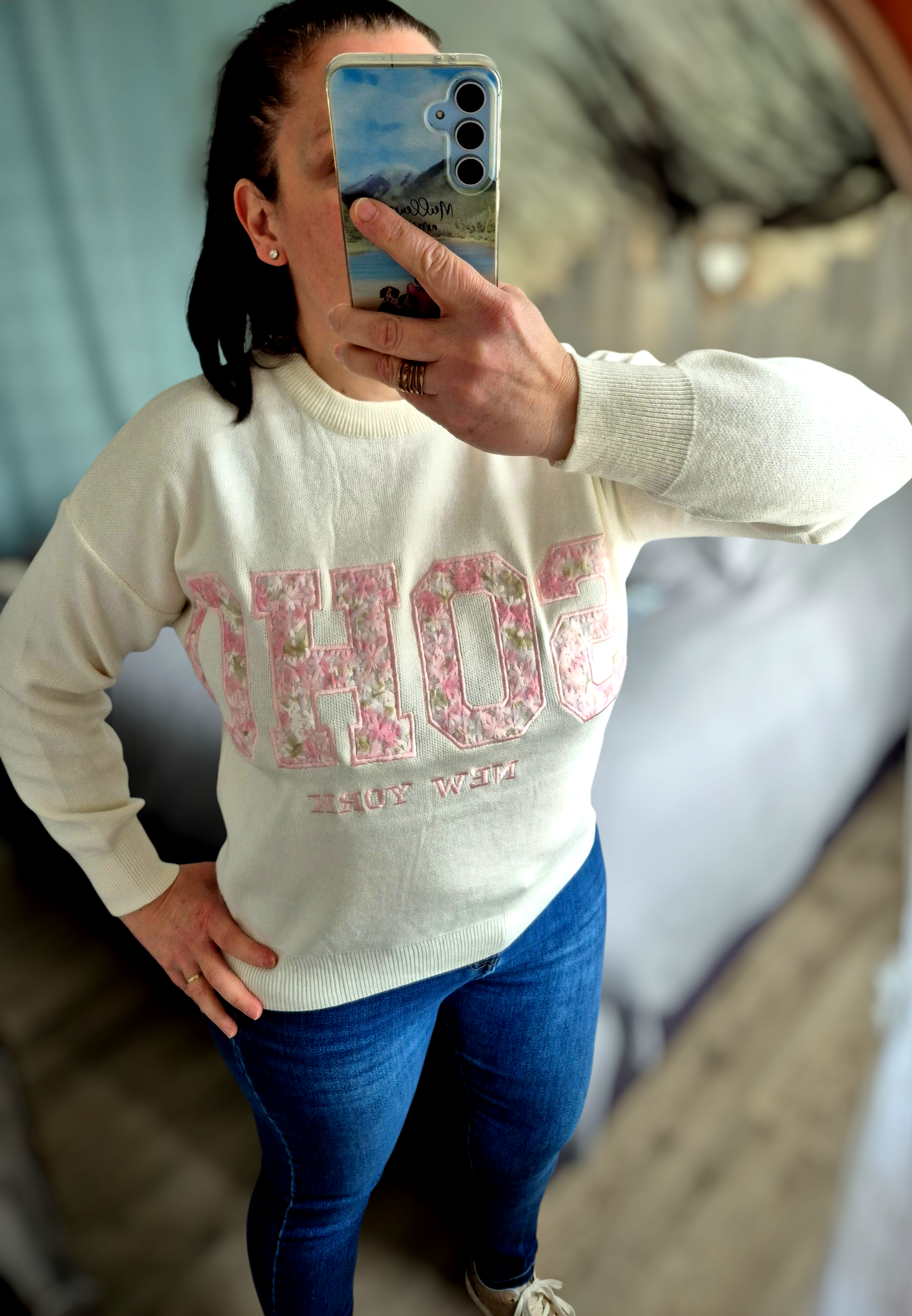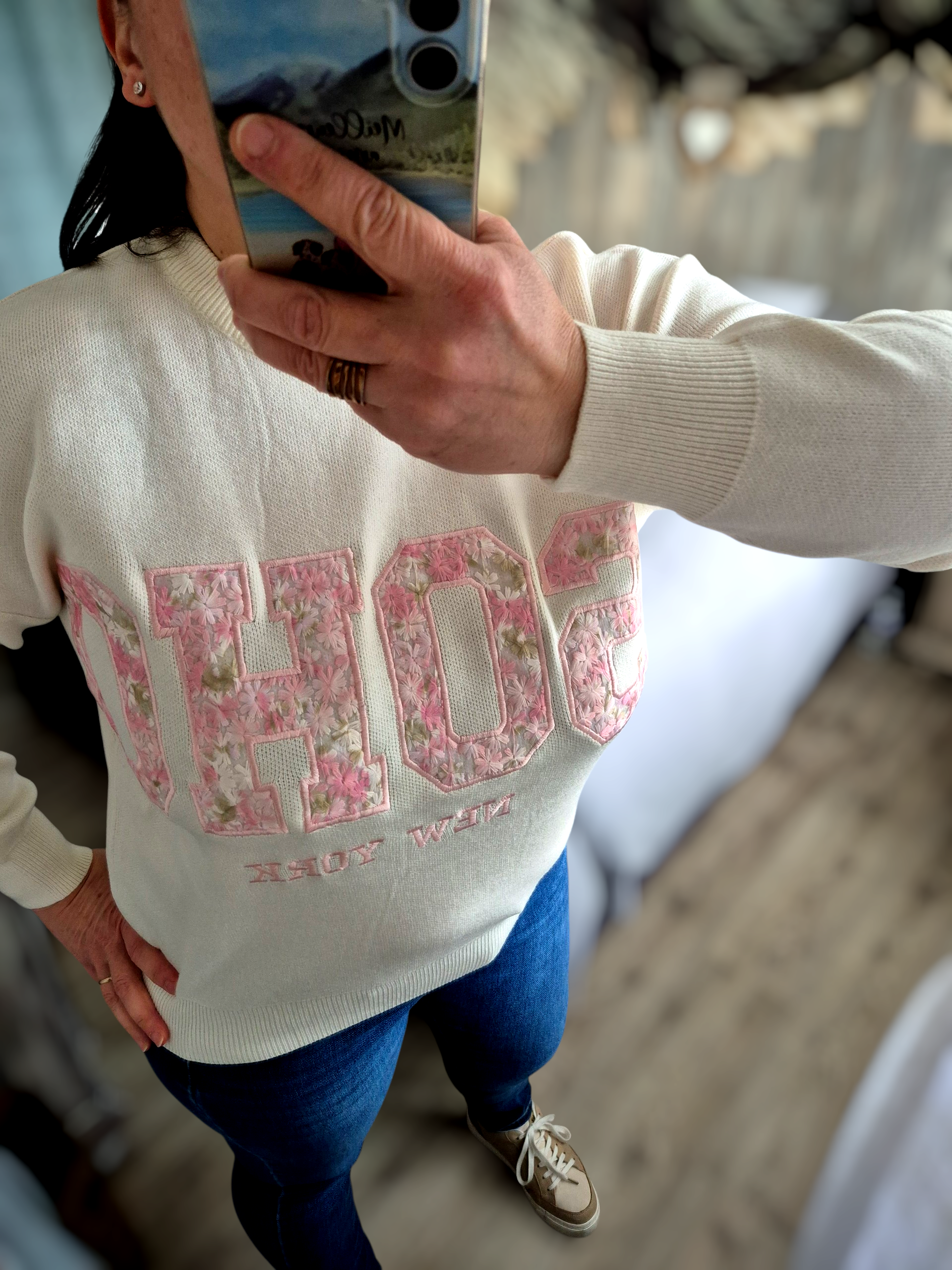 Craquez pour ce pull femme écru au style à la fois tendance et intemporel, inspiré de l’esprit new-yorkais. Son inscription “SOHO New York” en lettres florales roses apporte une touche romantique et moderne qui fait toute la différence.