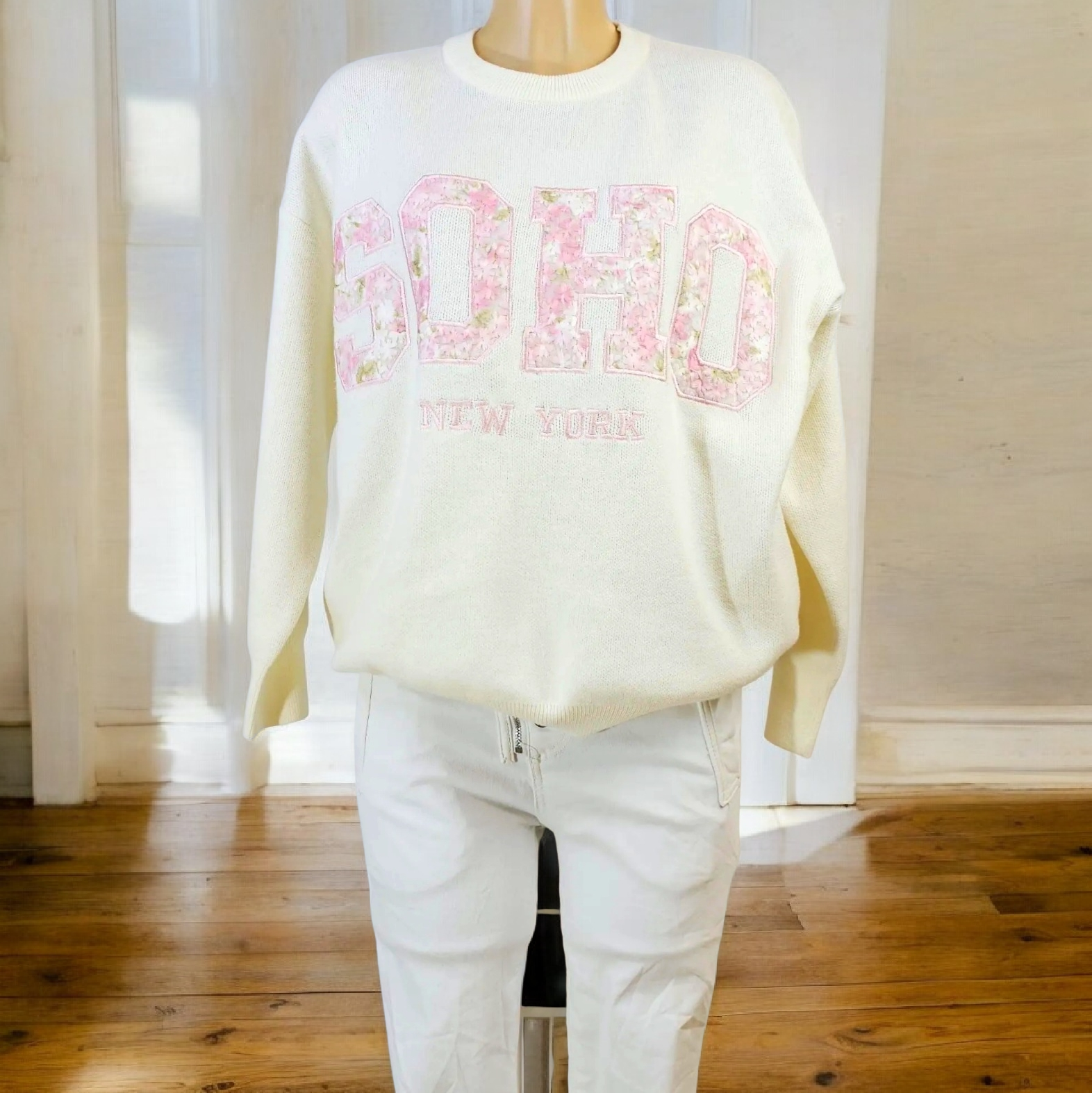 Craquez pour ce pull femme écru au style à la fois tendance et intemporel, inspiré de l’esprit new-yorkais. Son inscription “SOHO New York” en lettres florales roses apporte une touche romantique et moderne qui fait toute la différence.