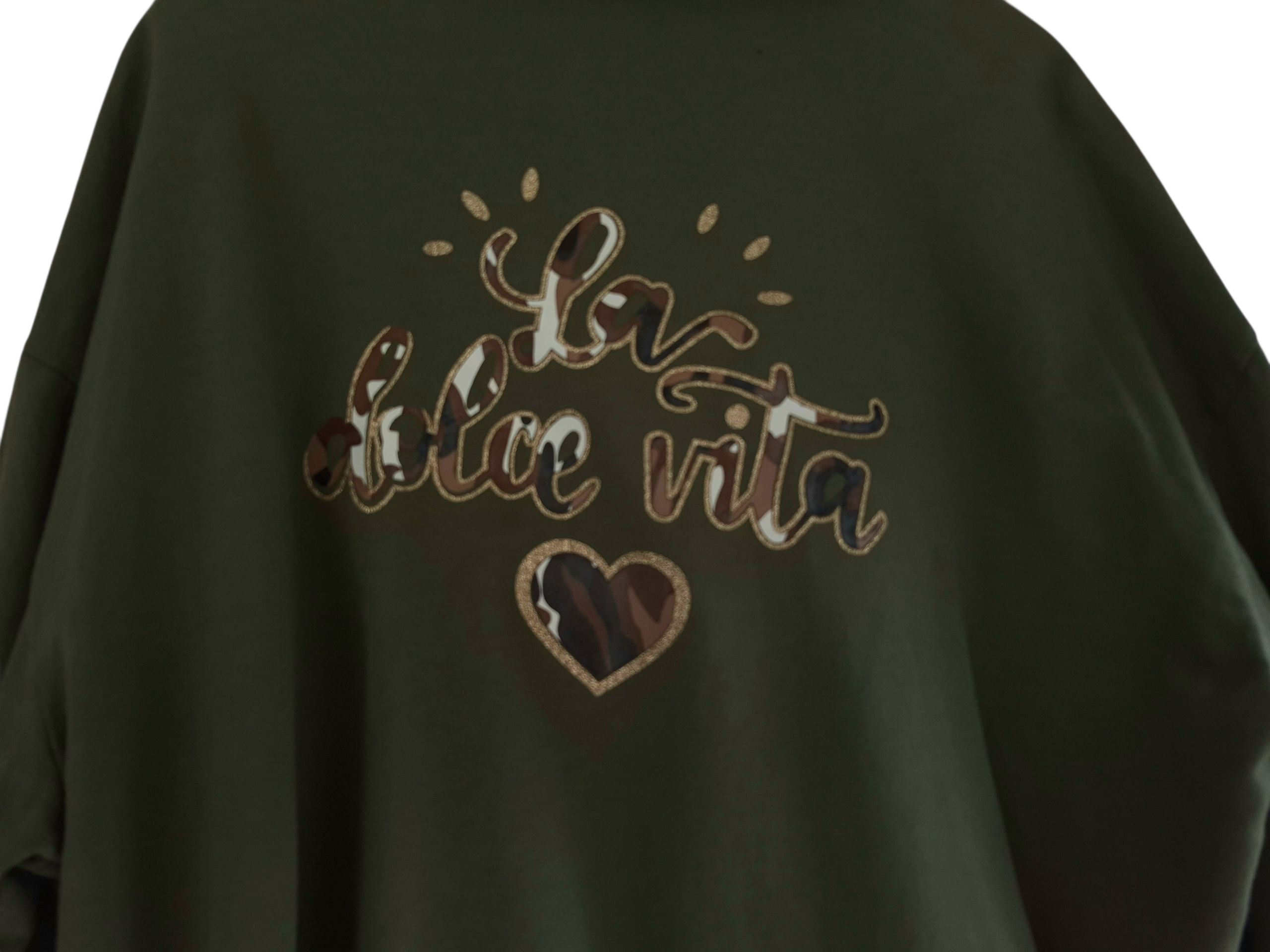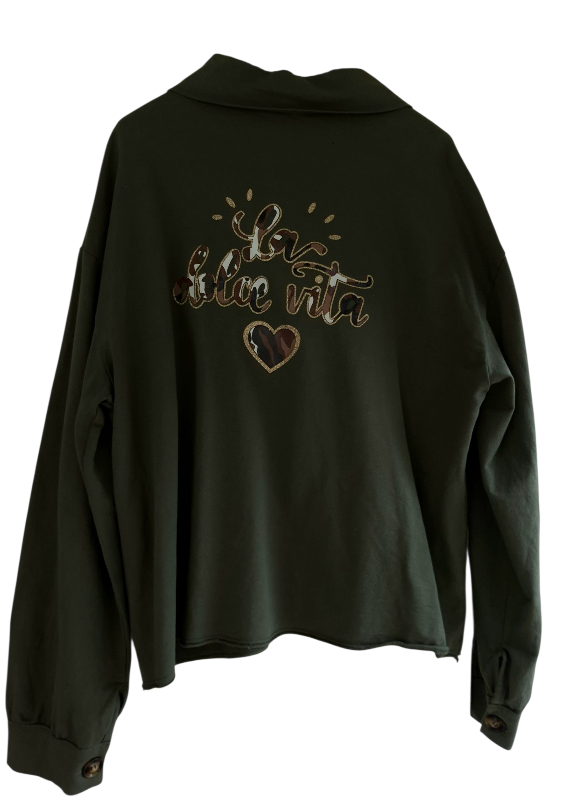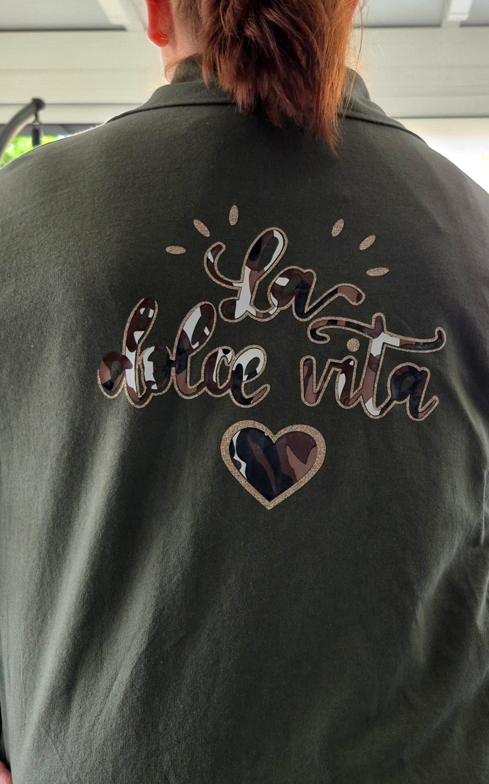 Optez pour un style tendance et confortable avec cette veste femme à boutons en 100% coton. Sa coupe décontractée, ses poches pratiques et son inscription élégante “La Dolce Vita” dans le dos en font une pièce originale et indispensable à votre garde-robe.